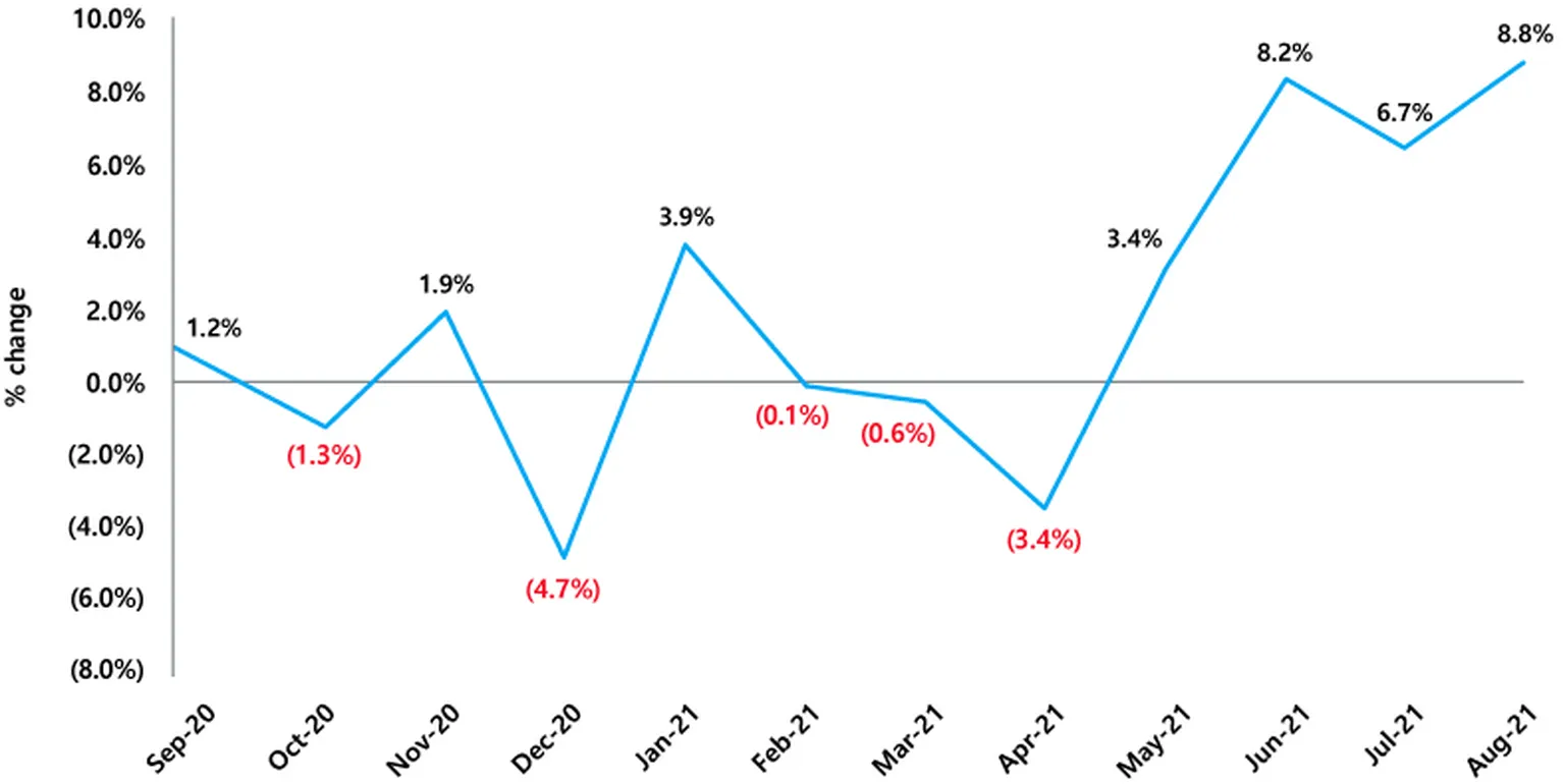 The most recent ABS retail sales data released for August 2021 showed a decline of 1.7%. This is the third monthly fall in a row and the lowest monthly sales figure since September 2020 (11 months). Sales were 0.7% lower than the corresponding month last year, although they remain at historically high levels being 6.3% higher than August 2019. Sales within the individual states continue to track their varying level of restrictions, with material decreases in New South Wales (3.5%) and Victoria (3.0%) and the Australian Capital Territory experiencing a sharp decline (19.9%) as their lockdowns continued through August. South Australia experienced strong growth (6.6%), with Western Australia (2.8%) also seeing an increase in sales.