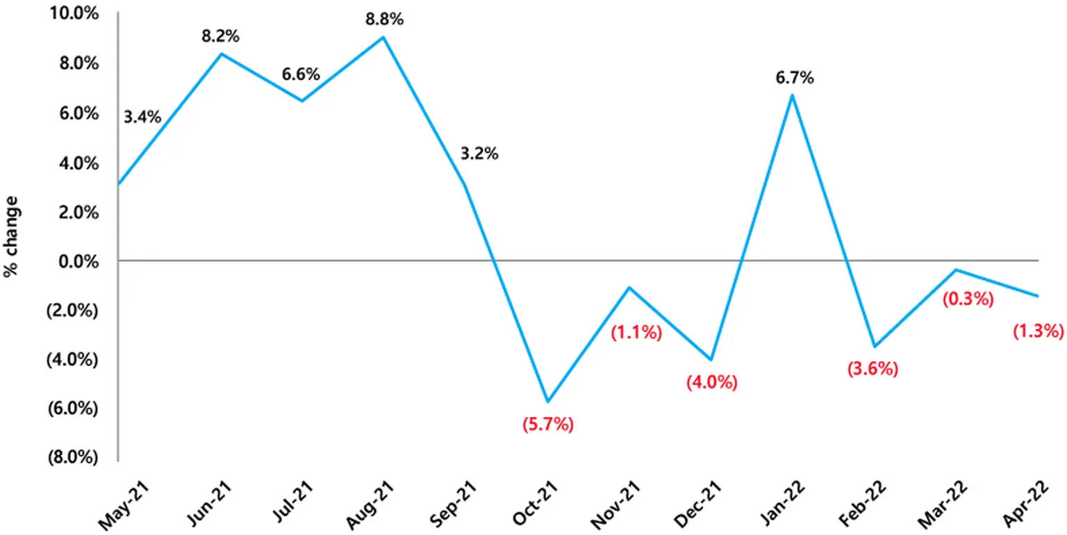 Online retail sales recorded a third consecutive month of decline in April 2022 (-1.3%, seasonally adjusted), however remained significantly up in year-on-year terms (+15.2% v April 2021). Department stores and grocery and liquor recorded growth, while homewares and appliances recorded a strong contraction. Online retail sales are estimated to represent 15.1% of retail sales reported by the ABS during the twelve months to April 2022 ($56.89 billion) and are 19.6% higher than the 12 months to April 2021.