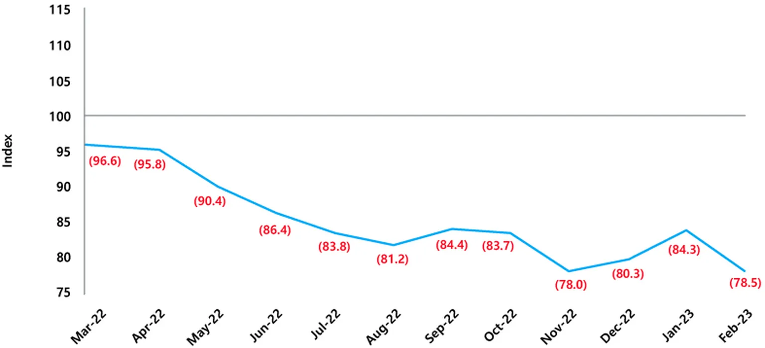 Consumer sentiment plummeted by 6.9% in February 2023 to 78.5, according to the Westpac-Melbourne Institute Index of Consumer Sentiment. After some uplift in the Christmas and New Year period, this steep fall has returned sentiment close to the historic lows recorded in November 2022 (78.0) and below peak pessimism during the GFC (79.0). While the RBA’s decision to raise the cash rate was generally anticipated, there was a significant variance between those surveyed before the announcement (83.5), compared to those surveyed after (74.8). The post-announcement negative response is likely a reaction to the RBA’s statement about more raises to come, with 80% of consumers surveyed indicating they expect rates will continue to rise in the coming months. A similar result occurred with the ‘House Price Expectations’ index, with a stark contrast recorded between pre-RBA announcement results (117.2) and post-announcement results (92.7), further revealing consumer sensitivity to rate rises. Rising rates will inflict further pressure on household budgets, compounding existing cost of living pressures.