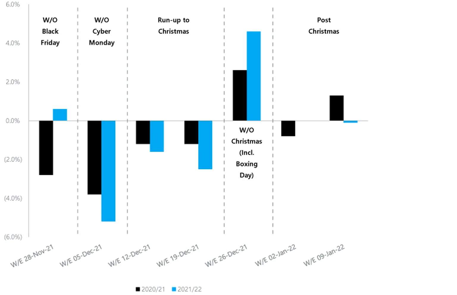Both 2020/21 and 2021/22 percentage changes are calculated against a 2019/20 baseline, being the last pre-COVID holiday trading period.