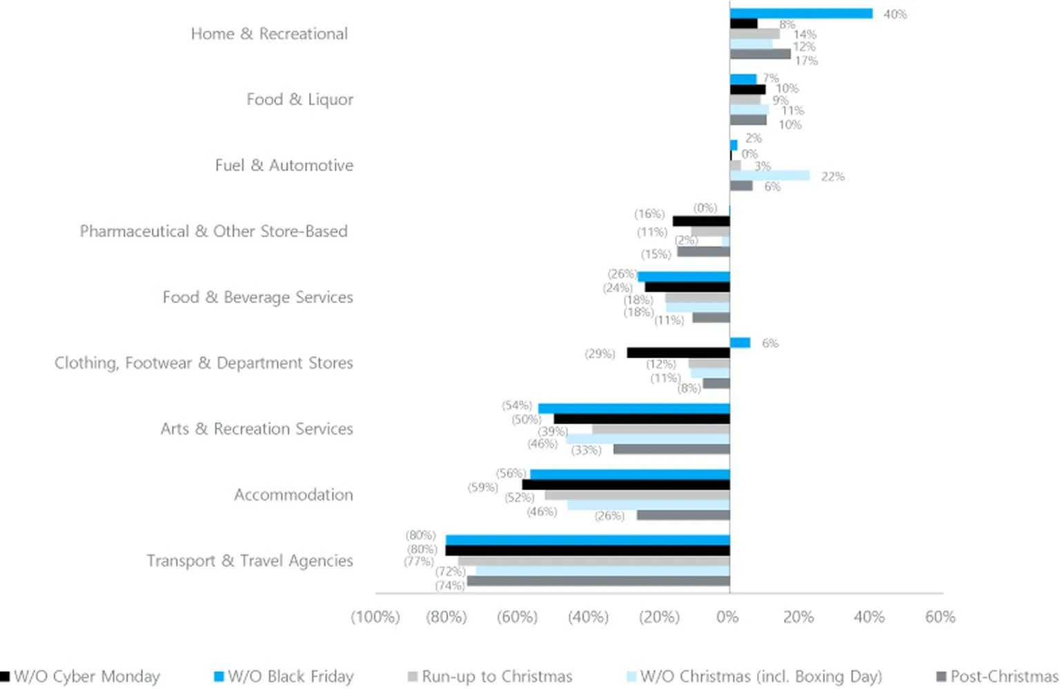 Only Home & Recreational (+19%), Food & Liquor (+9%), and Fuel & Automotive (+6%) exceeded spending pre-COVID in this holiday trading period. All the other subcategories continued to be below the pre-COVID holiday trading period in 2019/20.