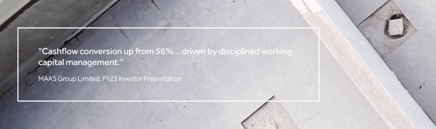 Lower DSO was recorded by 92% of our sample, reflecting process improvements but also a willingness by government agencies and developers to work with head contractors and expedite milestone payments. Interestingly, the increased discipline around billing and collections allowed companies to pass on the benefit to their suppliers, with 83% of our sample reducing DPO. In fact, average DPO in FY23 was the lowest it has been in six years, indicating a reversal in recent trends influenced by COVID lockdowns and the response by construction companies to defer supplier payments to improve their own cash flow. The result was the re-emergence of the "funding gap", where suppliers were paid more quickly than collections were made.